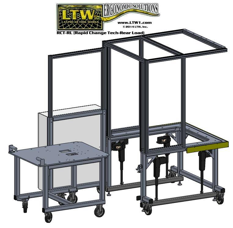 With the RCT-RL Rear Load System, customize the height adjustable workstation and docking cart with tabletop surface to include things like a light curtain mounting system and overhead frame system, saving time and floor space.